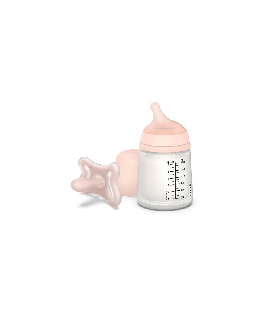 Este set incluye un biberón anticólicos de Flujo Adaptable específico para bebés que toman el pecho. Este flujo adaptable deja pasar más o menos líquido dependiendo de la fuerza de succión del bebé, igual que pasa con el pezón materno.