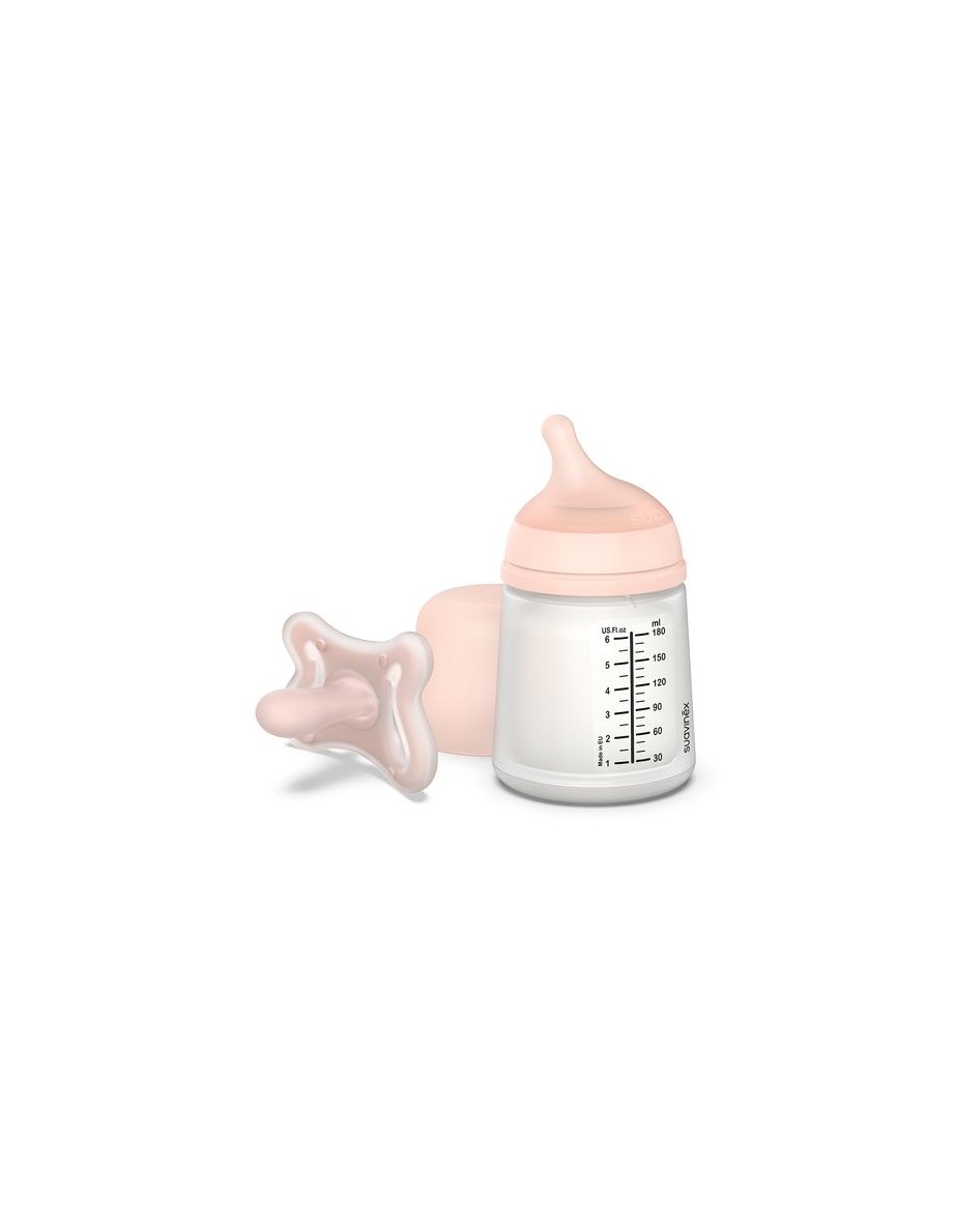 Chupete con tetina fisiológica SX Pro, diseñado para respetar el desarrollo bucodental del bebé. La tetina de este chupete ha sido diseñada para no invadir la cavidad oral y proporcionar al bebé la misma sensación que experimenta en su estado natural cuando no lleva chupete.
