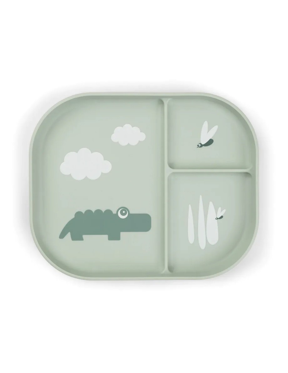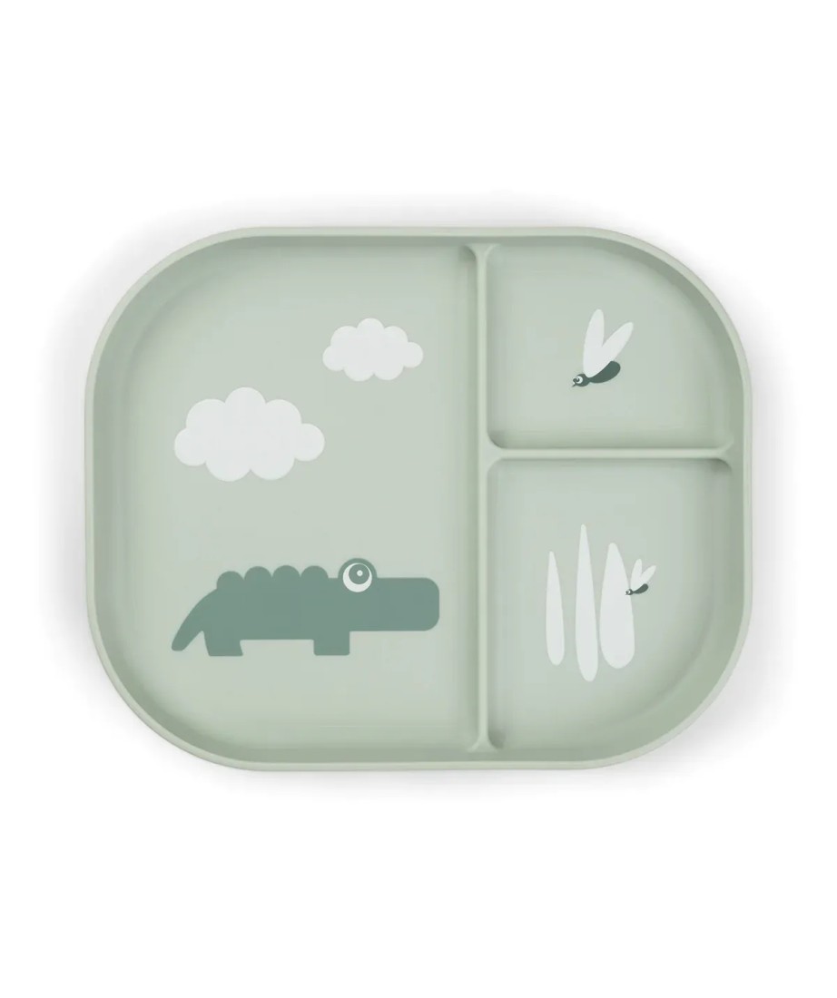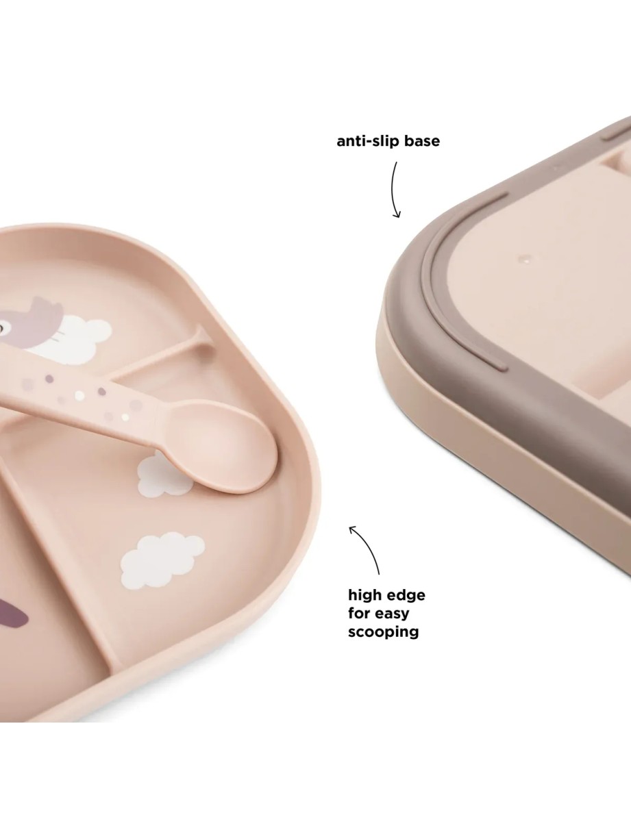 El plato con compartimentos en color polvo está estampado con un divertido motivo