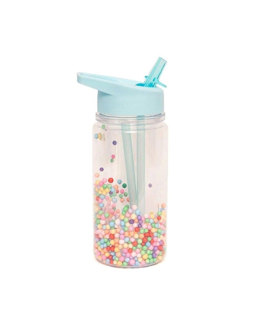 Botellas transparente con doble pared en cuyo interior se encuentran perlas de colores. Cuando mueves la botella, la agitas o la giras, observa como se mueven las perlitas multicolorLa botella tiene pajita que se levanta cada vez que quieras beber.