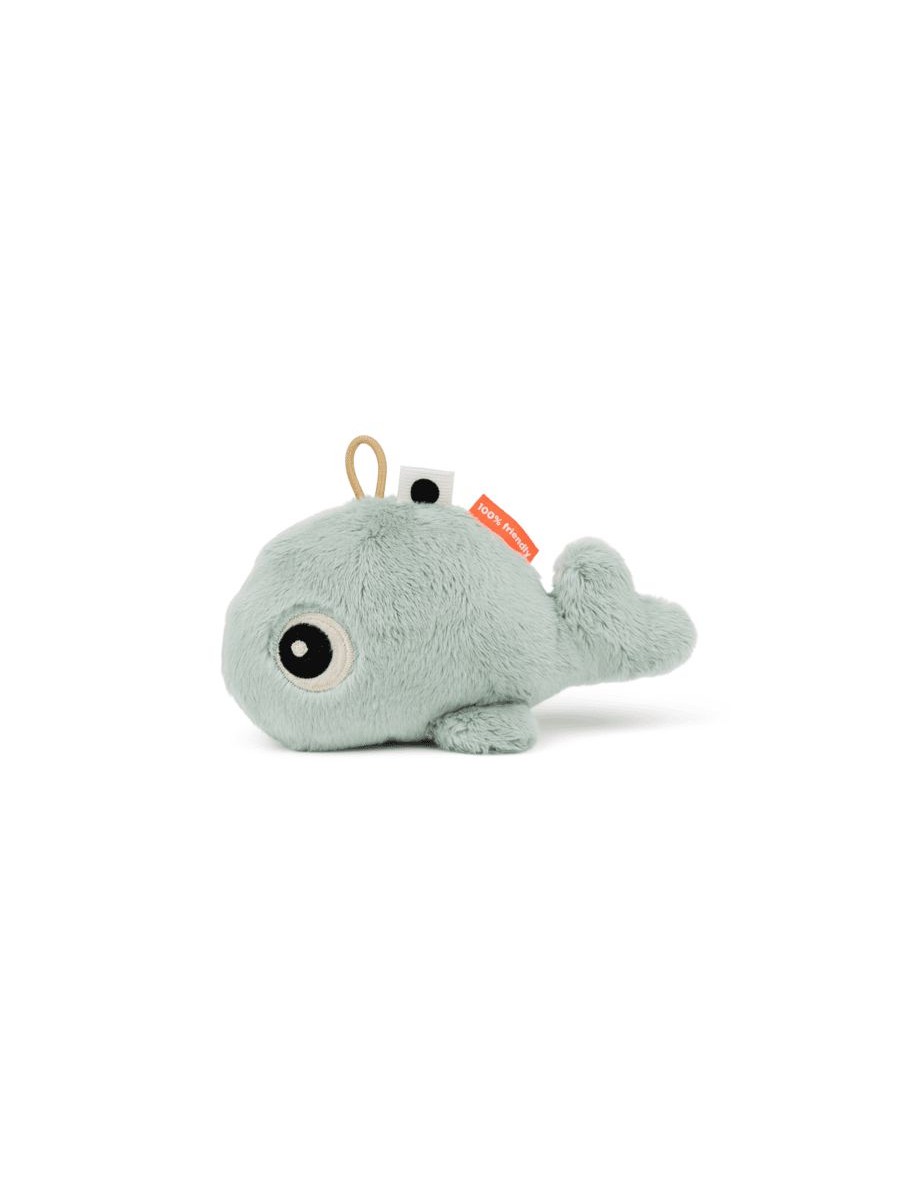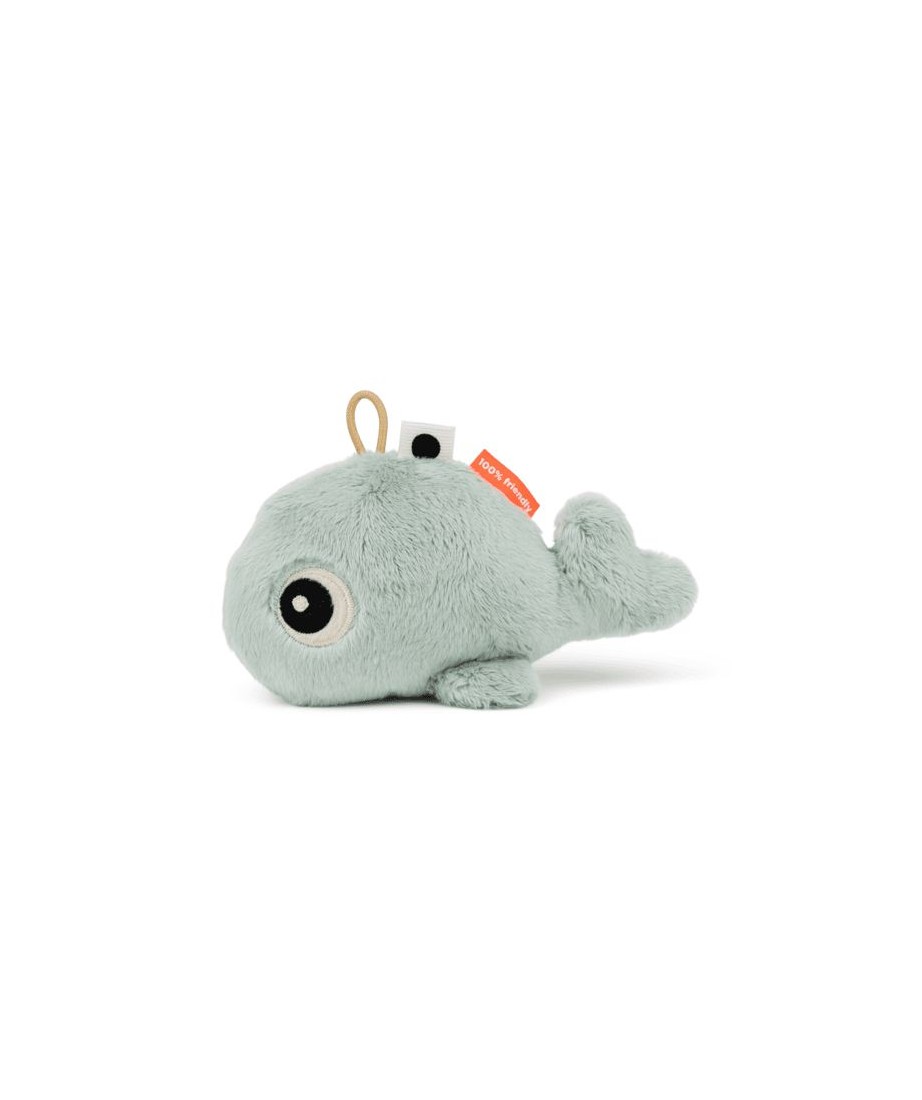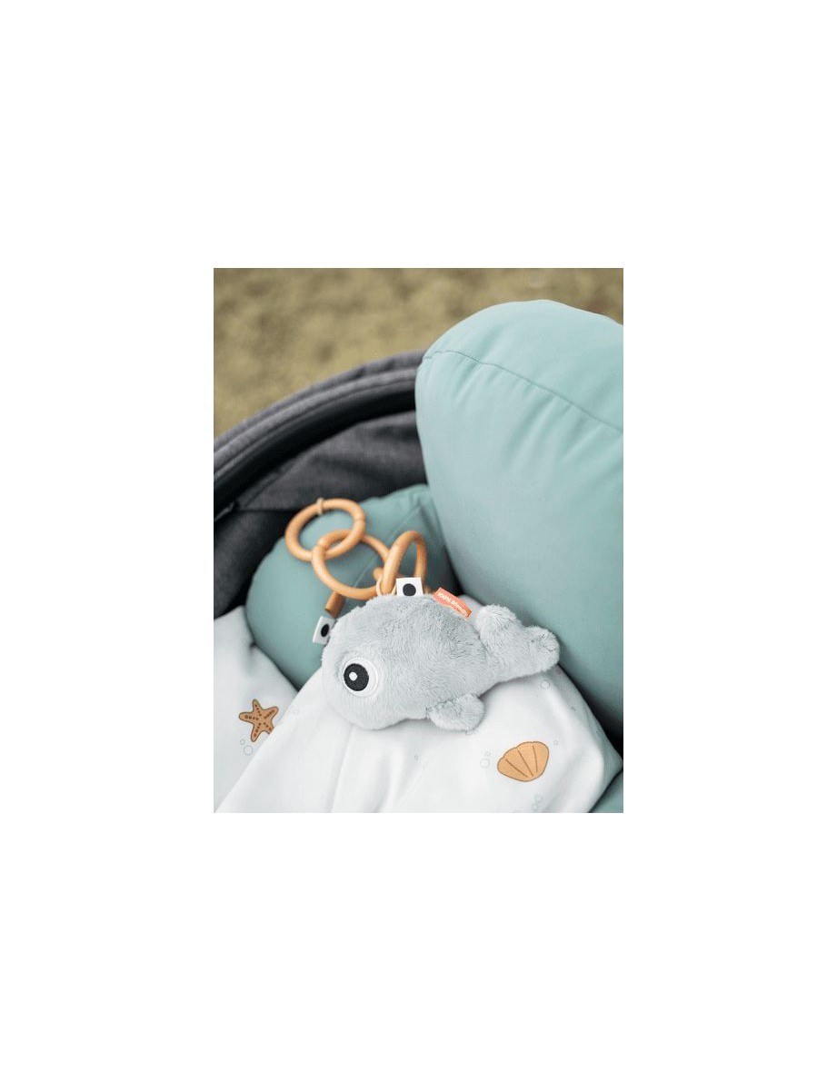 El juguete para bebés sensorial para llevar está en suaves tonos de azul con detalles en verde.