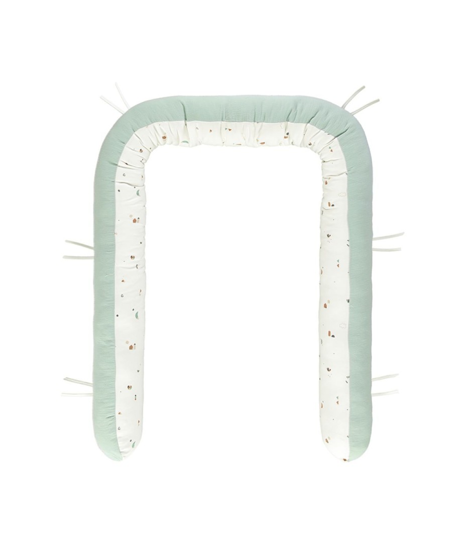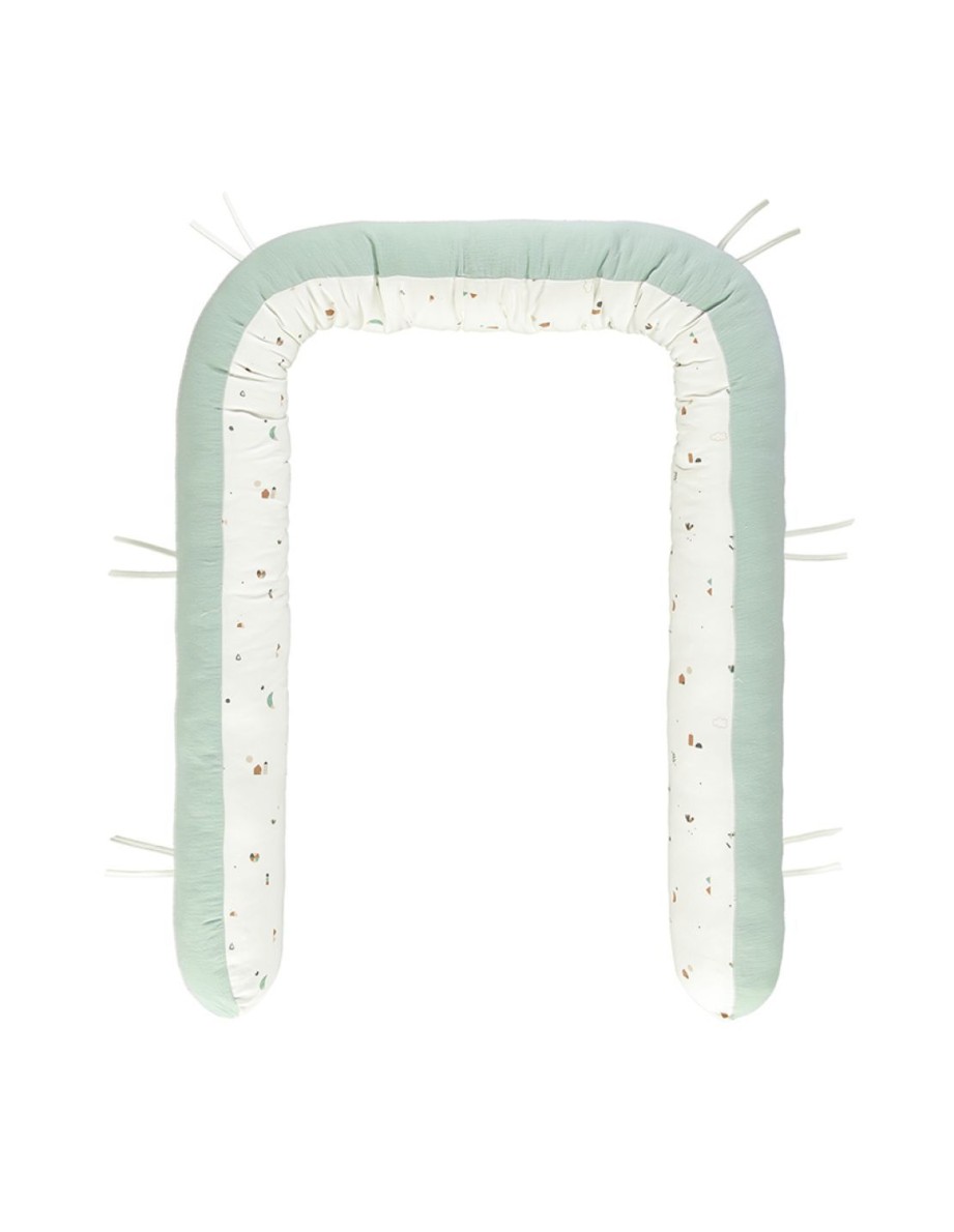Tejido de punto de algodón 100% y gasa de algodón 100%. Tratamiento especial anti-peeling. Desenfundable para fácil lavado. Interior de fibras de poliéster. Cintas para atar a los barrotes de la cuna. Medida: 230 cm - 12Ø Instrucciones de lavado: Lavar a máquina 30ºC - Planchado a temperatura media - No usar lejia - No lavar en seco. Esta prenda está diseñada y producida por el equipo de Babyclic en Barcelona (España).