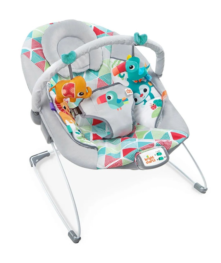 La Hamaca Bright Starts Toucan Tango es ideal para que tu bebé descanse cómodamente a la vez que juega y se entretiene. Cuenta con arco con juguetes colgantes, función de vibración, 7 relajantes melodías, y Stop automático a los 15 minutos de funcionamiento. Acolchado suave y confortable para proteger la espalda del bebé. El revestimiento se puede sacar para lavarlo cómodamente.