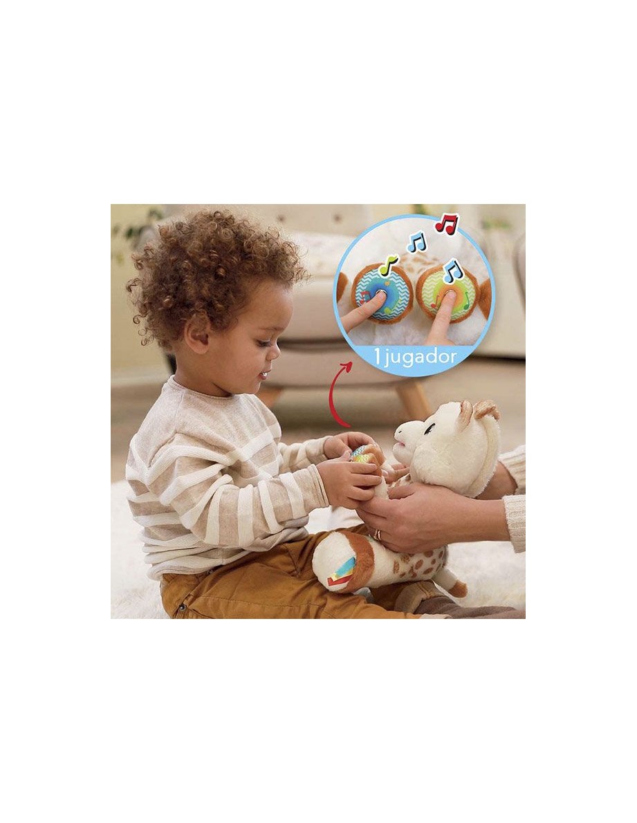 ¡Este peluche es perfecto para crear momentos de complicidad entre el bebé y su familia! Simplemente toca los dos sensores de las patitas delanteras de Sophie simultáneamente con los dedos, manos, pies o nariz para activar una nota musical. Con cada nuevo contacto de las dos partes con la piel, las notas se activan automáticamente y crean una melodía.