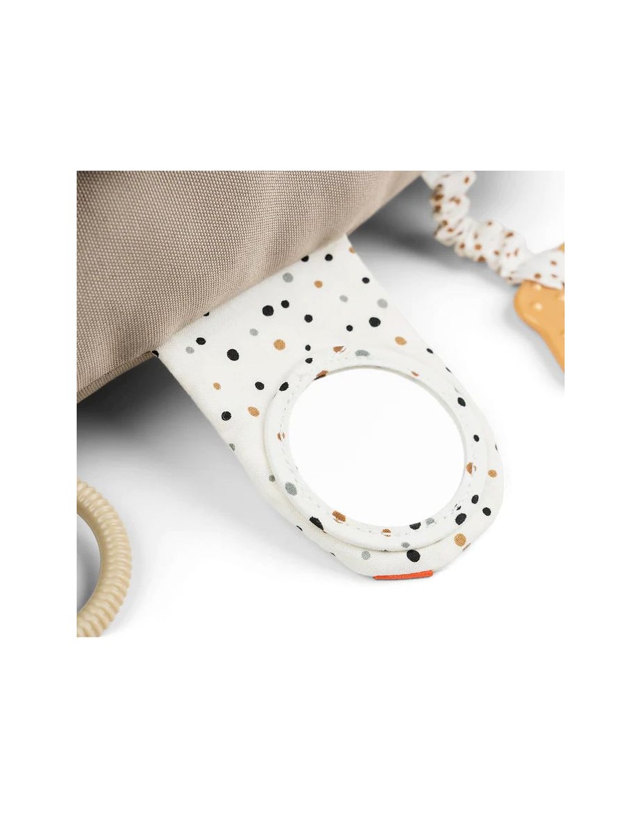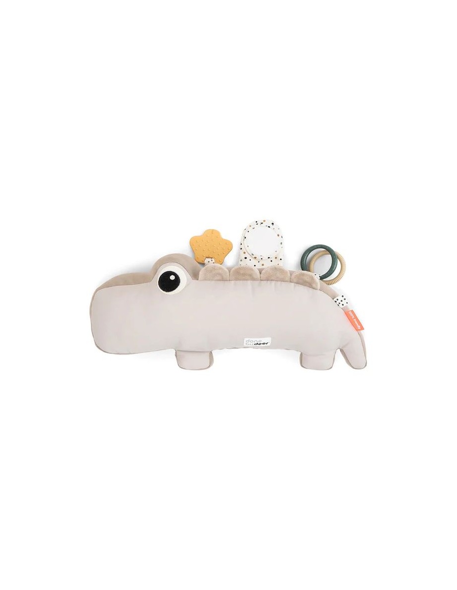 Con un mordedor en color mostaza y anillos para calmar la comezón en las encías, texturas táctiles, un pequeño espejo, etiquetas, sonidos de arrugas y una barriga de cocodrilo temblorosa, hay muchas actividades para que su bebé explore.