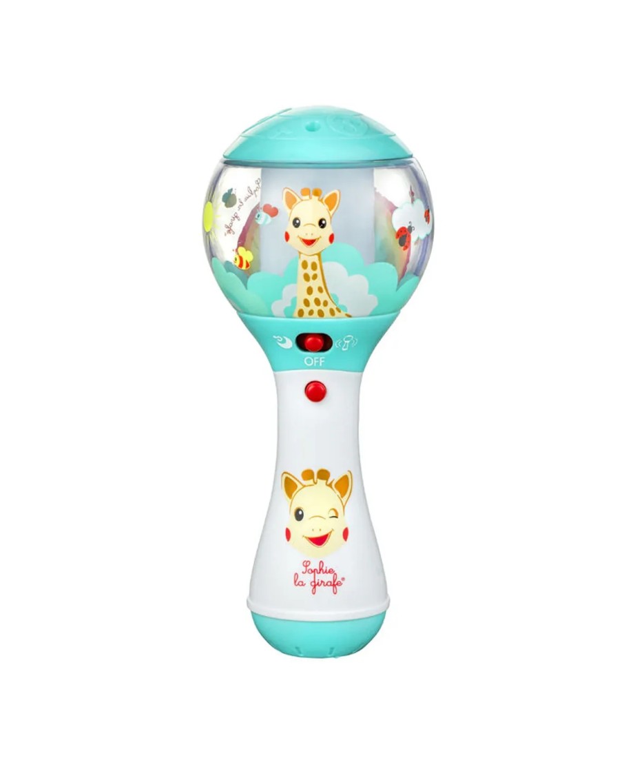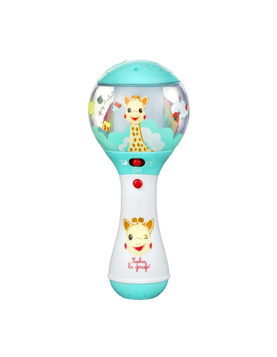 Un sonajero innovador y electrónico con la imagen de Sophie la girafe. Incluye un detector de movimiento para despertar al bebé y su luz parpadea al ritmo de la música y cambia de color cuando se agita.